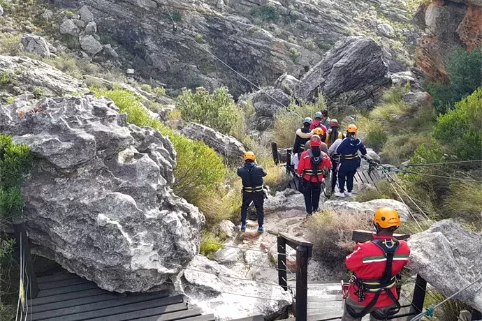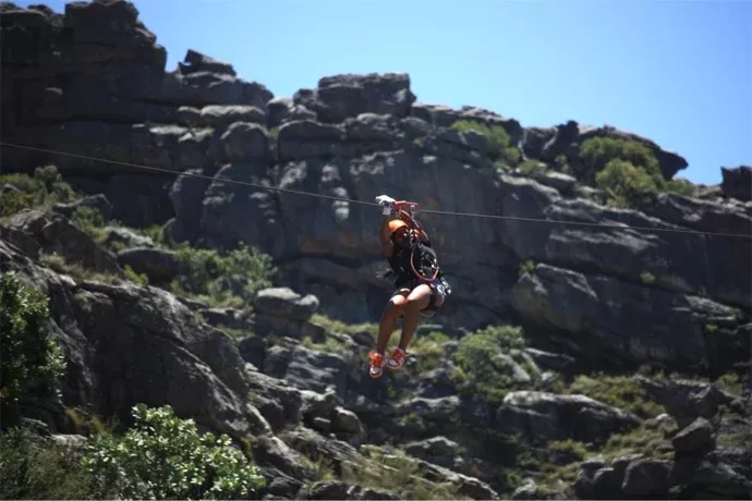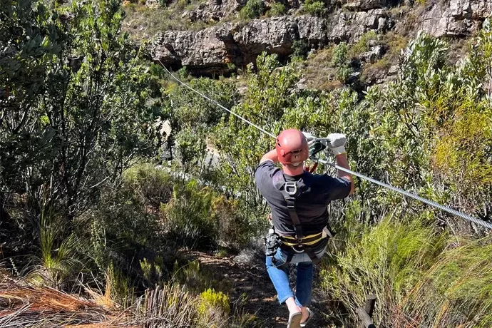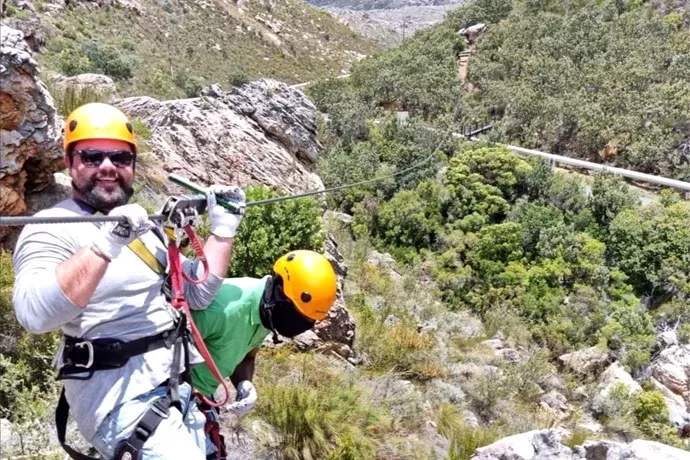 When you arrive, you’ll be equipped with a full-body harness and cutting-edge safety gear. Two experienced guides will accompany you on the journey, ensuring you’re safe and ready for each slide. A short, scenic bus ride (around 5km) will take you through the charming Ceres town and up to the mountain, where a brief walk will lead you to the first zipline launch point.