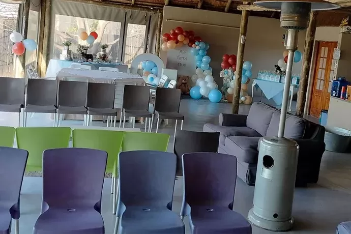 Our venue features a spacious 160m² thatched Lapa overlooking a picturesque garden. Inside, guests have access to a well-equipped kitchen complete with a fridge and microwave, perfect for event preparations. Seating arrangements accommodate up to 40 adults comfortably, with a mix of couches and café chairs. The venue is equipped with essential amenities including toilet facilities with a dedicated change table.