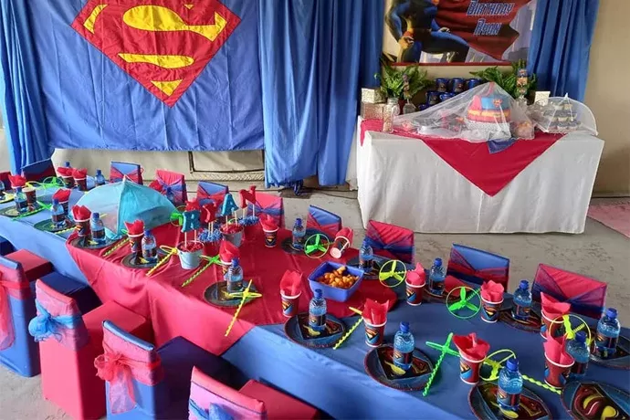 Decor 1: Tables and chairs, tablecloths and layovers, chair covers and sashes, Generic Birthday banner