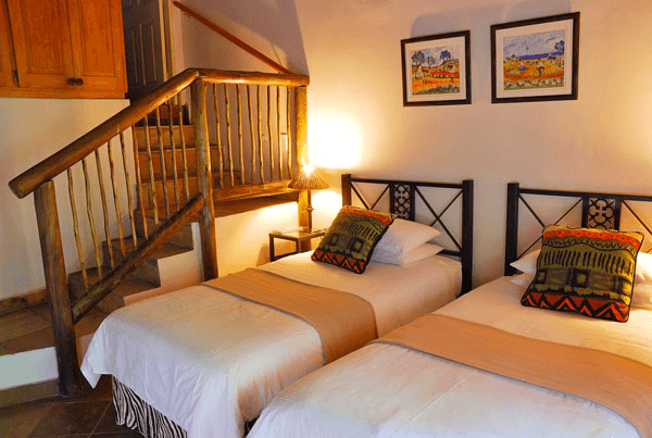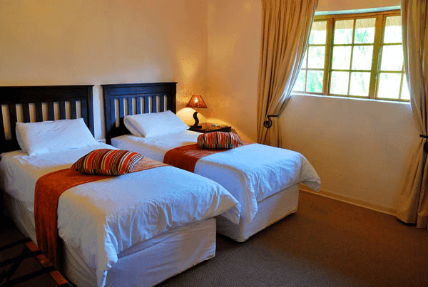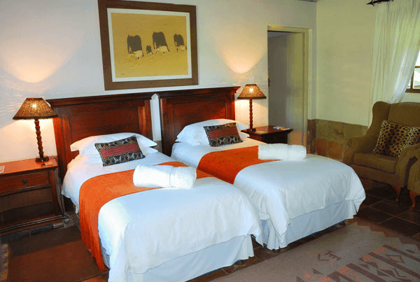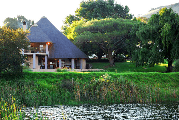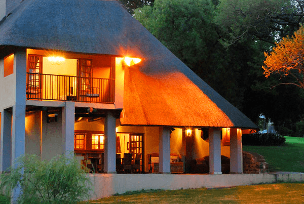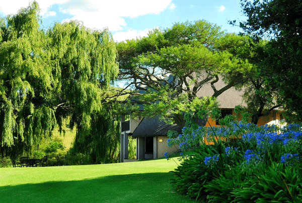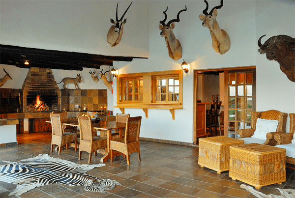 The thatch-roofed lodge, situated at the foot of the Biggars Mountain, some 45 kilometres from Dundee (in KwaZulu Natal), nestles amongst willow and paperbark trees in the tranquility of a lush, park-like garden. Nxala Ranch is situated in a malaria free area.