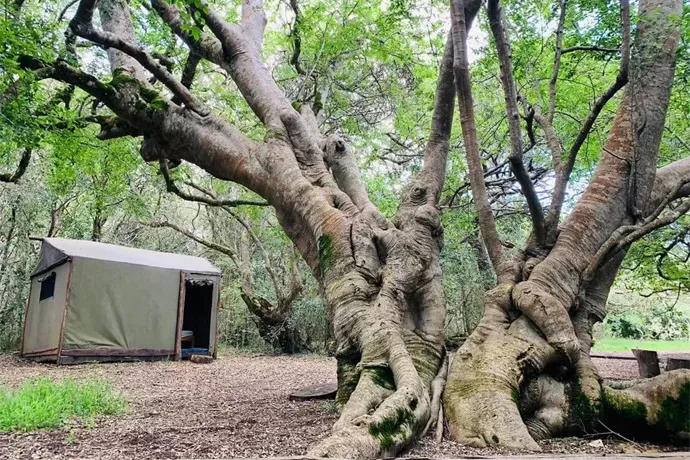 Ideal for glamping enthusiasts, this eco-friendly camp offers a furnished tent for two, with space for additional guests to pitch tents or park a camper van. It’s a relaxed, budget-friendly option for groups or families who want to experience the forest up close.