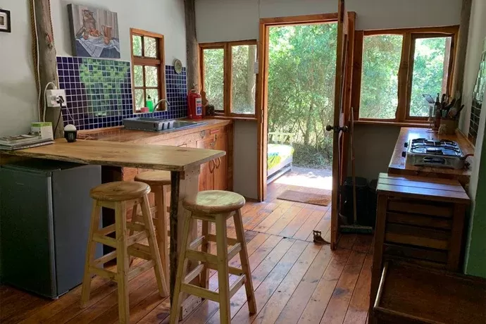 Immerse yourself in nature with this secluded off-grid hideaway. Perfect for two guests, this retreat offers a peaceful setting surrounded by indigenous trees and birdsong, with complete privacy and forest views.