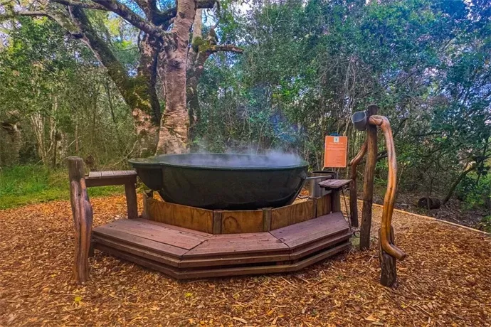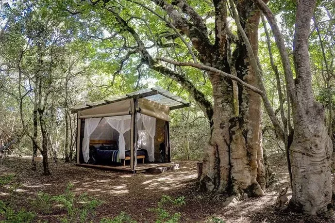 An off-grid, eco-conscious tented suite designed for couples seeking serenity and seclusion. Relax in your private wood-fired hot tub beneath the graceful canopy of a white stinkwood tree and enjoy exclusive use of this beautiful forest haven.