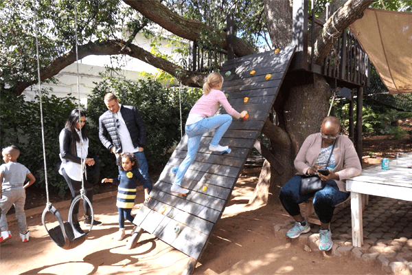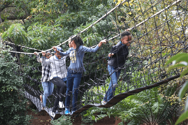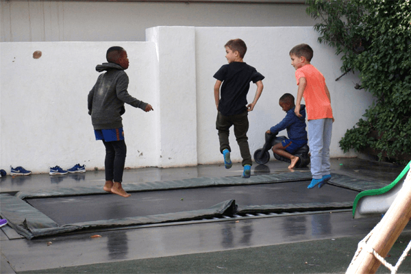 In our garden we have a wooden jungle gym with a huge trampoline surounded by a smooth scooter track. Connecting 2 of our big old trees 3m above the ground is our “Bridge of Courage". Acces to it is up a climbing wall on the one side and at the other end of the bridge is a 3m tall fireman's pole for the kids to slide down onto a soft mat, allowing them to conquer their fear of heights.