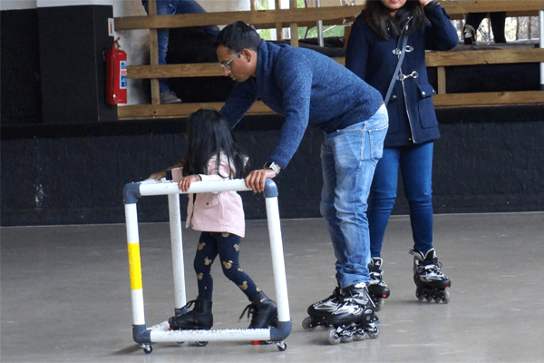 We have skate mates that our beginner skaters can push around the rink. This gives them support and confidence until they can skate unsupported. They cost R50/hour.