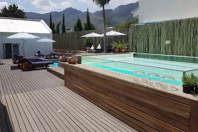 Soak up Franschhoek’s stunning mountain views from the expansive wooden deck. Cool off in the sparkling pool, stretch out on a lounger, or sink into the outdoor hot tub — an ideal way to relax and take in the natural surroundings.