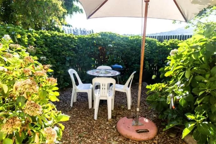 Ideal for flexible accommodation, Guest Room Two features a king bed convertible into twin beds, a small kitchenette with essentials for minor self-catering needs, and a private outdoor space with stunning mountain views.