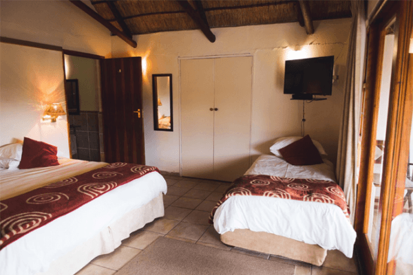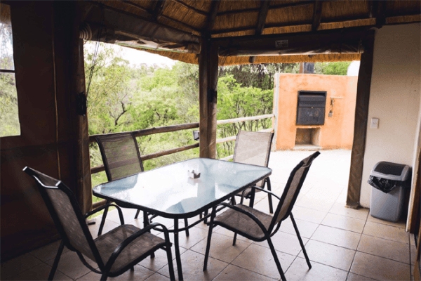 Our lodges are situated in a pristine bush garden and designed for our guest’s privacy and proximity to nature. All our lodges overlook a natural riverbed and onto the scenic bushveld, with free roaming game and bird life.All lodges are self-catering, fitted with fully furnished kitchenettes, en suite bathrooms and private, yet spacious Lapa’s, designed for both the cosy winter night and temperate summer sunsets.The double lodges consist of a master bedroom, with DSTV and a luxurious queen size bed and a second bedroom with three single beds for the kids. Each room has a large glass sliding door, looking out onto the natural habitat.We also offer tailored packages to suit your needs, which include catering, breakfasts and picnics.